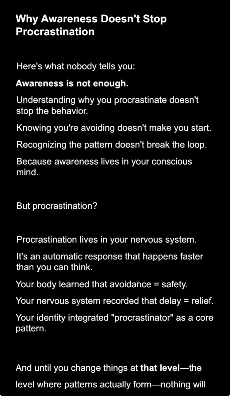 Shame spirals after every delay - Beating yourself up for "knowing better," which made you feel worse, which made you avoid more. Endless loop of self-punishment.